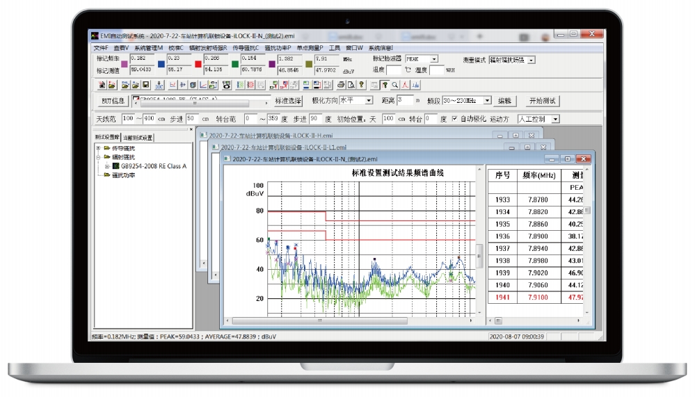可以选择查看测量结果曲线、测量时的仪器设置、测量结果的数据列表以及超标点的数据列表。
