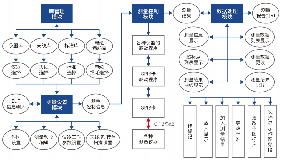 完善的库管理功能、完善的测试控制流程,提供多频段测量控制