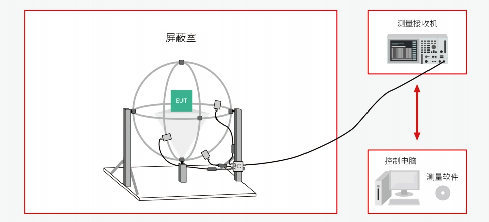 依据CISPR 15电气照明标准,对荧光灯及其他放电灯所用的独立镇流器、半灯具、自镇流灯、灯具等进行磁场测量。测量期间,受试样品(EUT)置于三环天线系统(LAS)中心,通过同轴开关切换X,Z三个方向,并连接到EMI接收机,通过软件测量EUT的磁场强度。测试可在屏蔽室或暗室内进行。