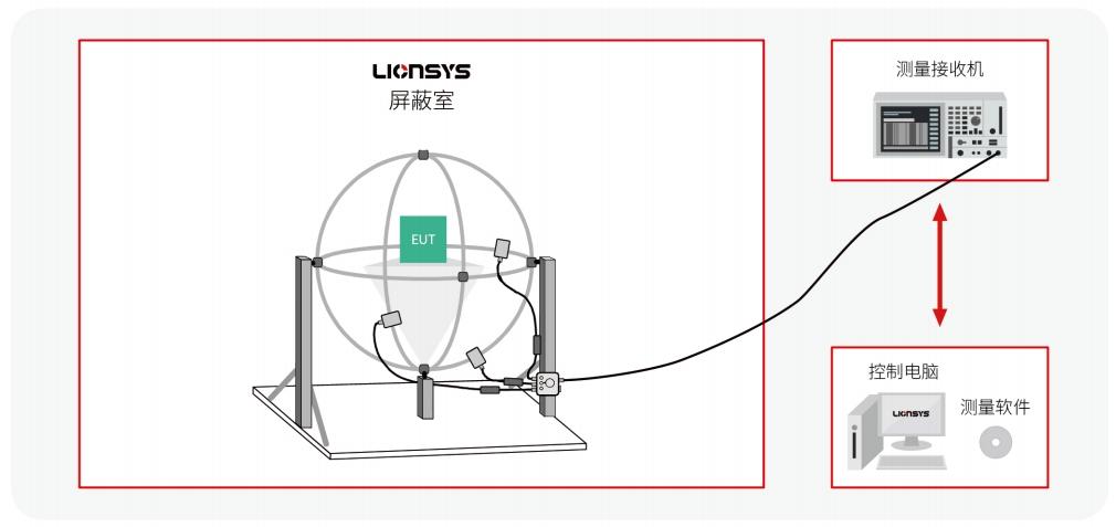 依据CISPR 15电气照明标准,对荧光灯及其他放电灯所用的独立镇流器、半灯具、自镇流灯、灯具等进行磁场测量。测量期间,受试样品(EUT)置于三环天线系统(LAS)中心,通过同轴开关切换X,Z三个方向,并连接到EMI接收机,通过软件测量EUT的磁场强度。测试可在屏蔽室或暗室内进行。
